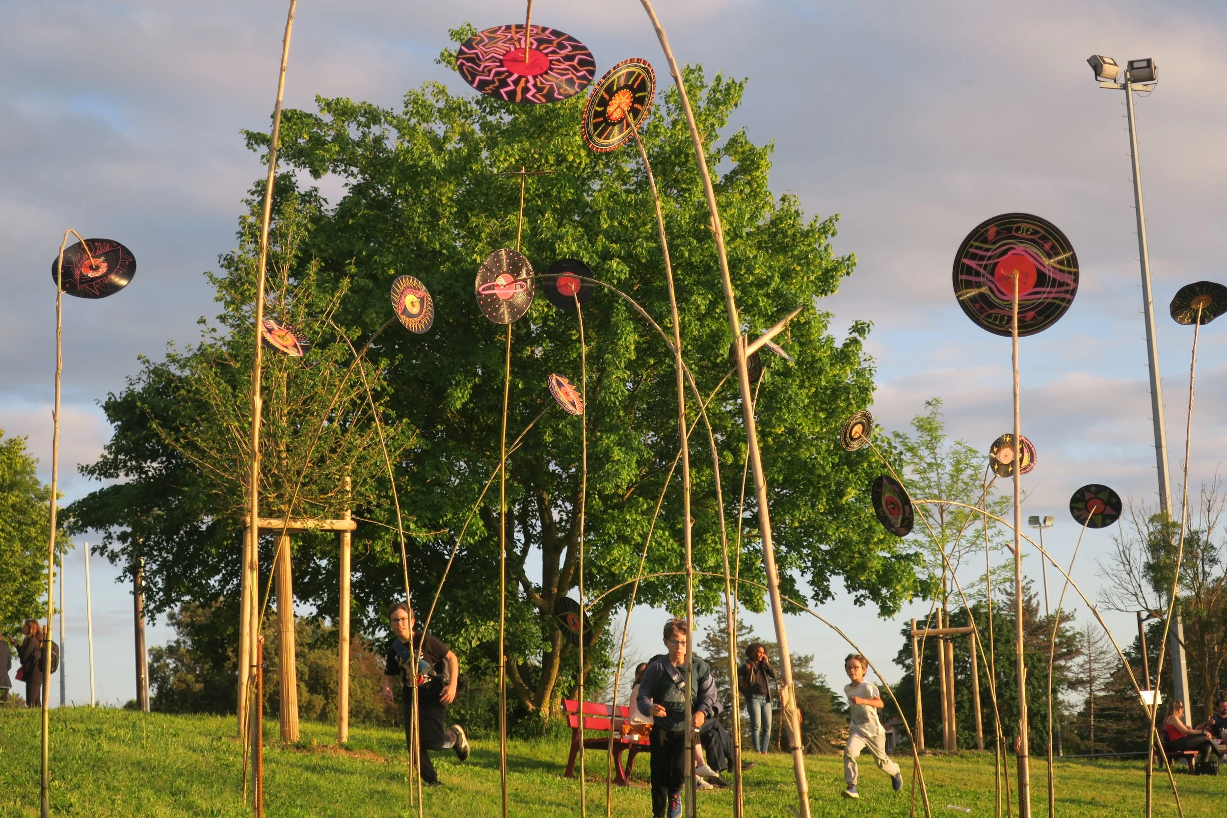 Le public fut invité à créer un œil sur un disque vinyle ensuite accroché sur une canne de Provence fixée au sol. Ces personnages imaginaires ont pris place dans l’espace et se balancaient au gré du vent. Environ 500 cannes de 2,50m à 4m de haut ont été installées pour habiller l’ensemble du festival.